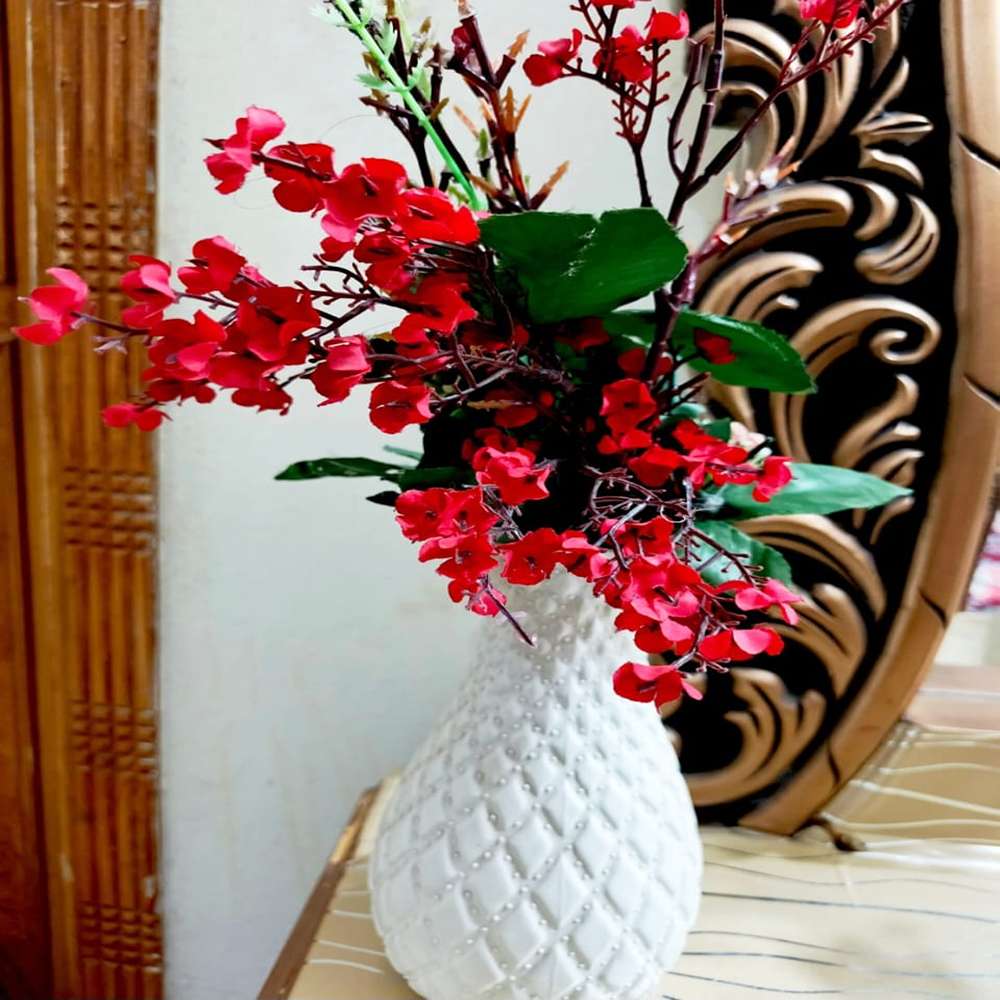 Add a striking burst of color and beauty to your interior with this Scarlet Bloom Artificial Flower Vase. Designed to capture attention, the bold red blossoms in this arrangement exude passion, warmth, and vibrancy. Set in a white diamond-textured vase, the contrast of deep crimson petals against the pure white base creates an eye-catching balance between elegance and energy.